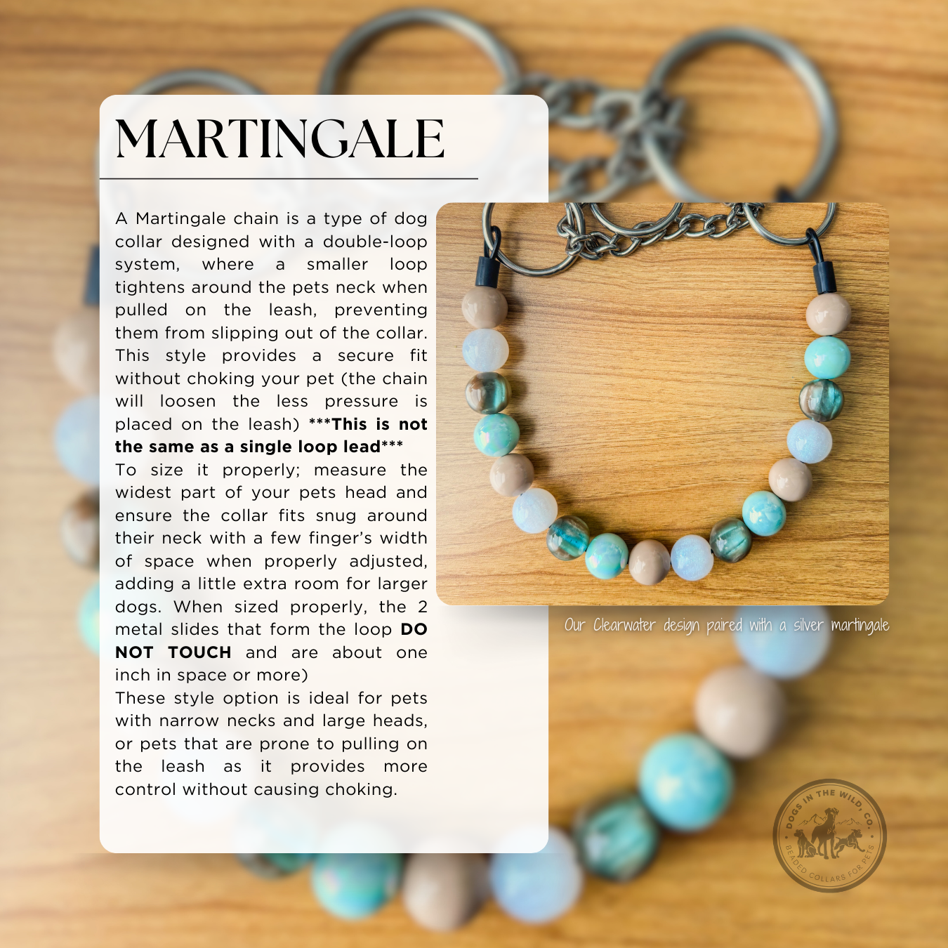 - Sizing is crucial as the slip-on style only functions by sliding on and off your pets head (no fixed adjustability) We will accomodate the size of the martingale chain to the size of the collar ordered. Please do not include/remove any additional lengths when measuring as we will calculate and take into account the length of the chain on our end.